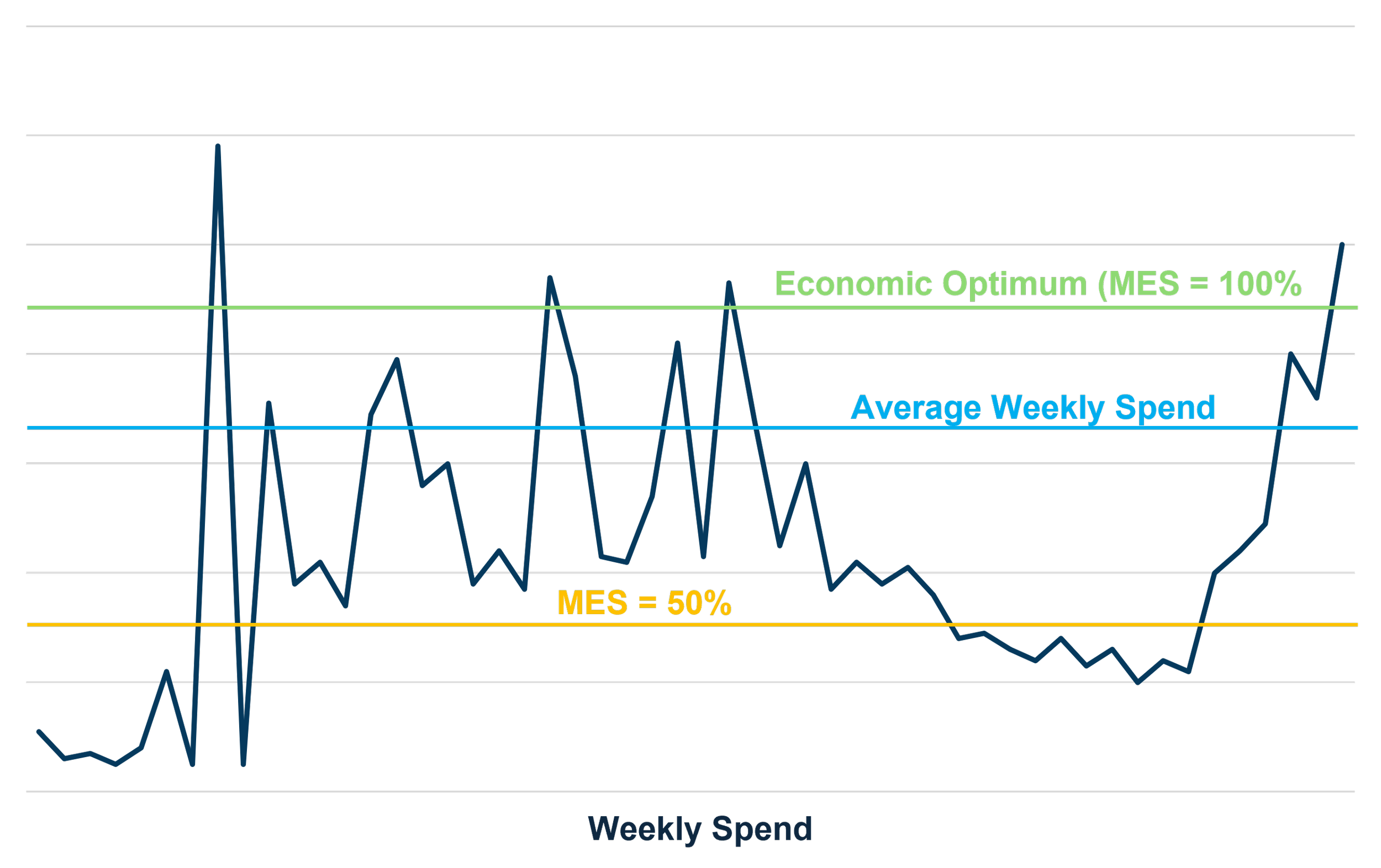 When the blue line is between the yellow line and the green line, the average weekly spending for the medium, Social in this case, is very efficient and operating week-to-week on the upper half of the MES curve (between 50% / minimum CPS and 100% / Economic Optimum). When the blue line is below the yellow line or above the green line, weekly spend levels should be closely evaluated.