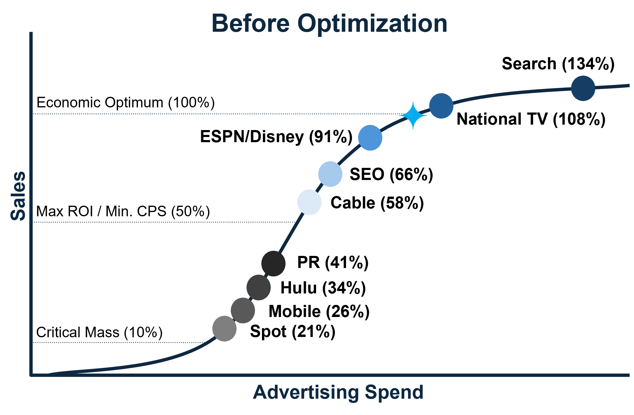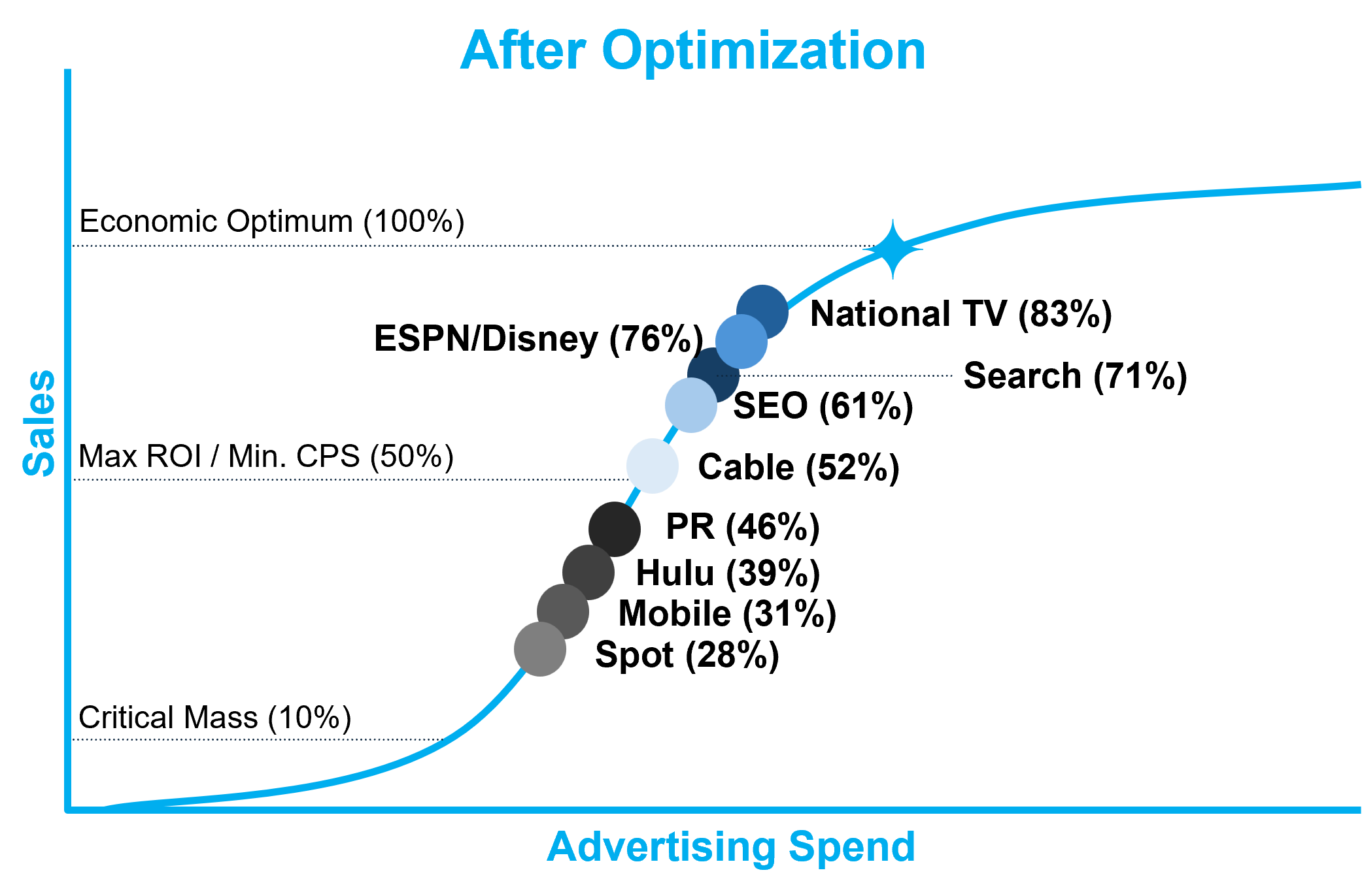 By understanding media / tactic elasticities, budgets, and ROI, we can determine how to reallocate your ad budget to make every ad dollar work harder. This is how we maximize sales, market share, and ROI. Optimizing the marketing mix through reallocating budgets based on Omnichannel Optimization produces maximum lift at minimum costs and routinely generates 15%-30% increase in sales and 10-20% decrease in cost with the first to second quarter of optimized activity.
