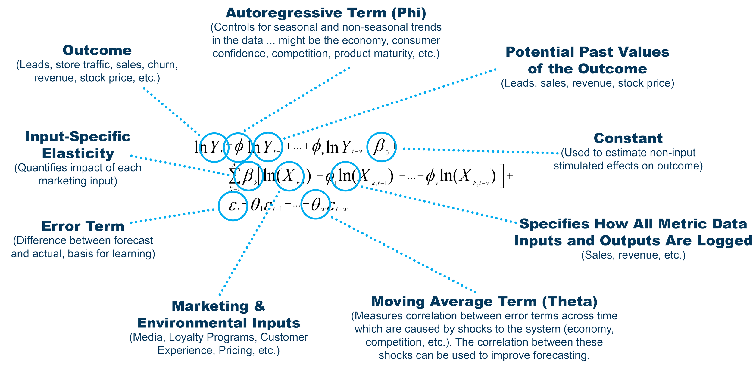 Xs represent a company’s marketing and advertising inputs (TV, Radio, Print, Search, Display, etc.) as well as other critical inputs such as Consumer Confidence, Weekly Wages, Inflation, and other factors.